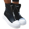 Realizzato in materiali di alta qualità, questo modello si distingue per la pratica doppia zip frontale che può essere completamente aperta o chiusa, trasformando il look e l’indosso con un solo gesto. La punta bianca a contrasto conferisce un tocco urban-chic, mentre la suola platform (altezza 5,5 cm sul tallone e 4 cm sull’avampiede) garantisce slancio e stabilità, offrendo il massimo comfort anche dopo molte ore. Il gambale misura 14 cm, per una calzata che avvolge la caviglia con eleganza e sicurezza.