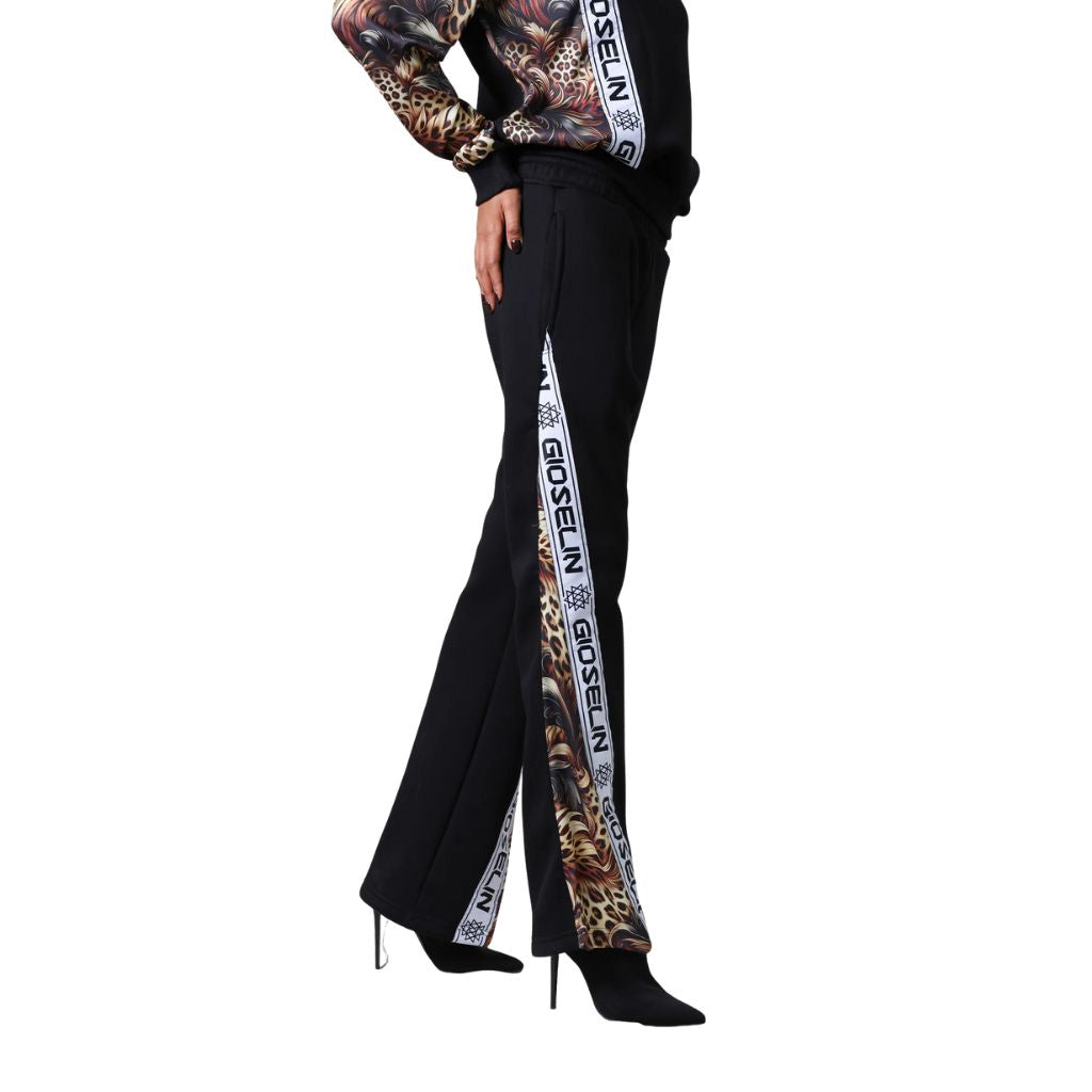 La felpa è arricchita da elastico sul fondo e inserti in raso a tema barocco/wild, che aggiungono un tocco di luce e raffinatezza al total black. Il pantalone, con elastico in vita, presenta un elegante taglio a zampa che valorizza la figura mantenendo la comodità tipica dello stile urban.