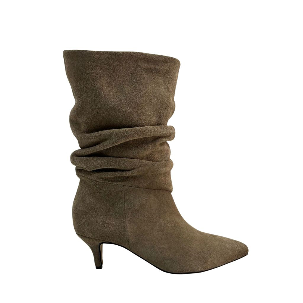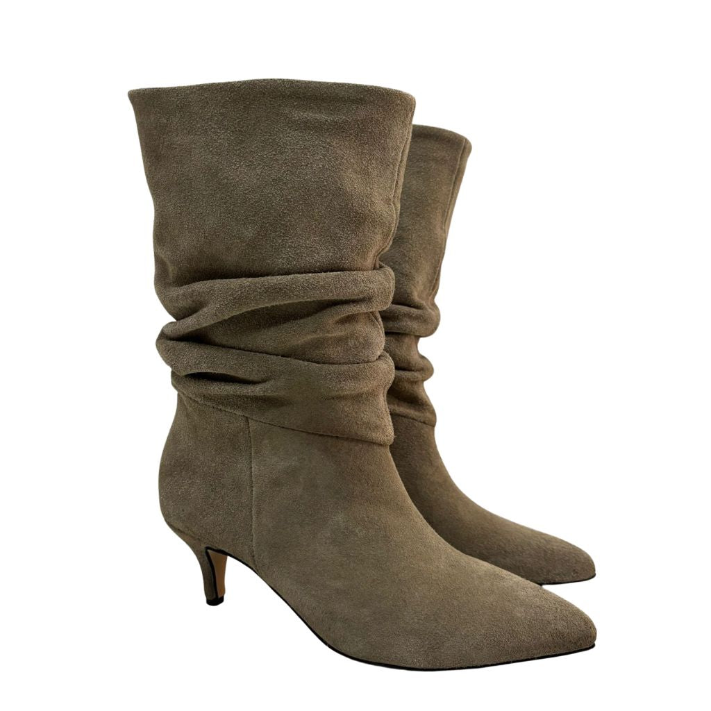 La tomaia in camoscio taupe si sviluppa in un gambale medio con una ricca arricciatura a balze sovrapposte nella parte centrale, un effetto slouchy volutamente irregolare che richiama l'estetica degli anni '80 reinterpretata in chiave contemporanea. La superficie vellutata del camoscio esalta la tridimensionalità delle pieghe, creando giochi di luce e ombra che rendono ogni stivale unico. La punta appuntita allarga il contrasto con la morbidezza del gambale, aggiungendo un tocco di precisione sartoriale.