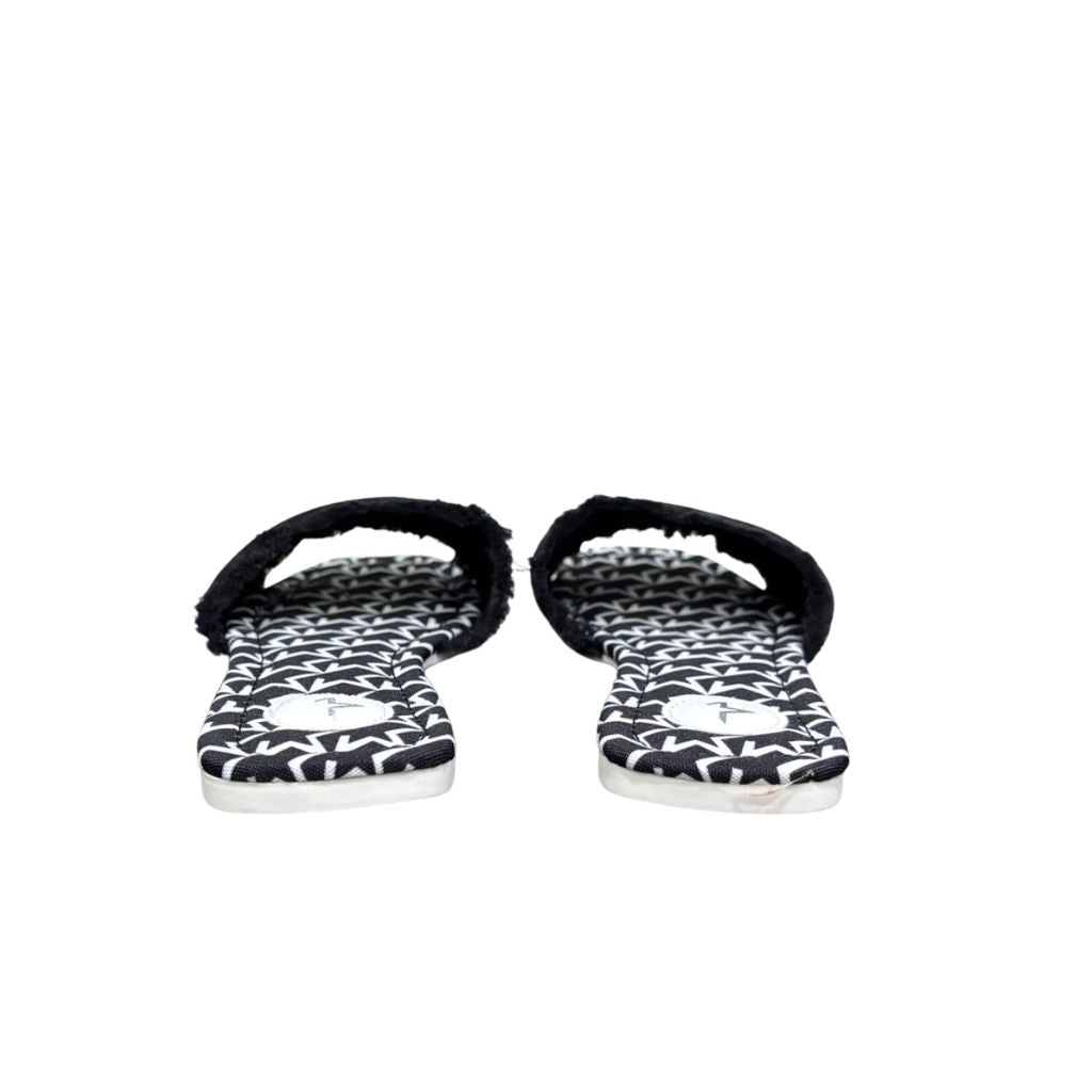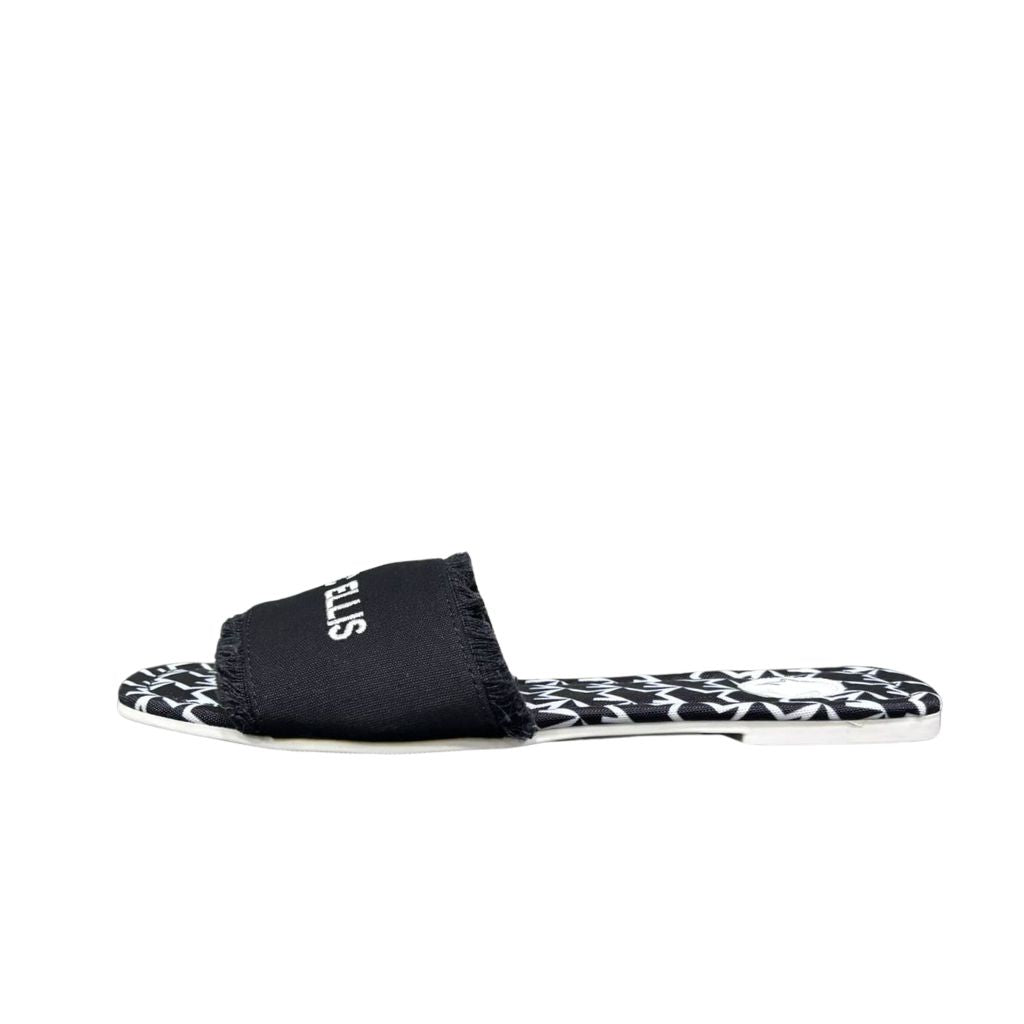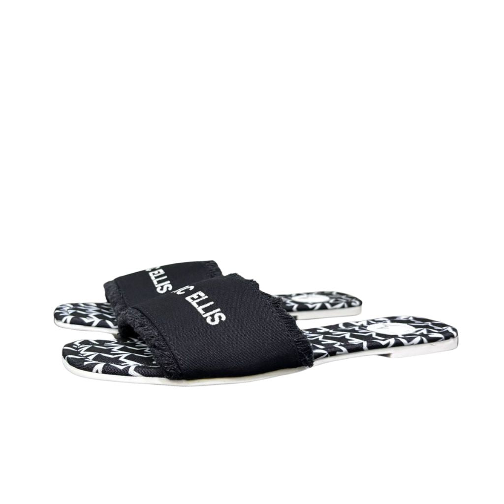 Le Ciabattine Nere di Marc Ellis reinterpretano il classico sandalo flat in chiave bold e contemporanea. La fascia frontale in canvas nero con frange irregolari porta il logo Marc Ellis ricamato in bianco, creando un contrasto grafico netto e riconoscibile. Il plantare è rivestito con il pattern monogramma del brand in bianco e nero, un dettaglio che trasforma ogni passo in uno statement di stile. Versatili e senza tempo, queste ciabattine si abbinano con facilità a look estivi, beachwear e outfit casual, mantenendo sempre un'identità di marca forte e definita.